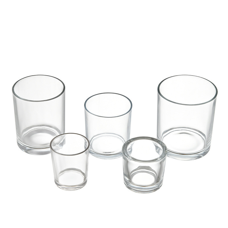 Clear glass body, consistent wall thickness, compatible with standard wicks and metal lids. Available in transparent, frosted, tinted glass, and custom mold designs.